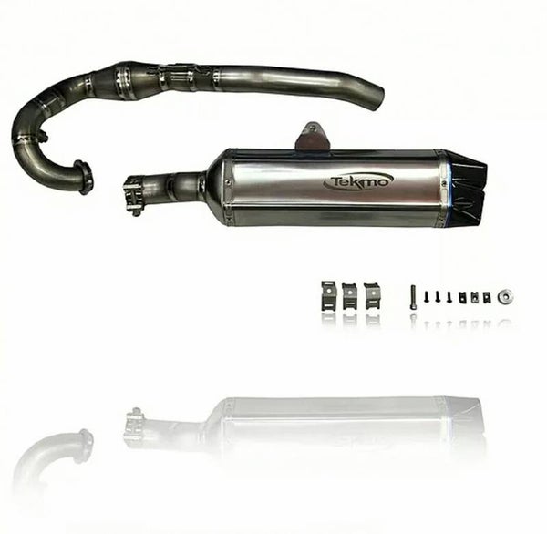 A fully tricked out 3 pcs system and 1 into the muffler that has twin exit. This new muffler will fit the stock Husqvarna standard header.